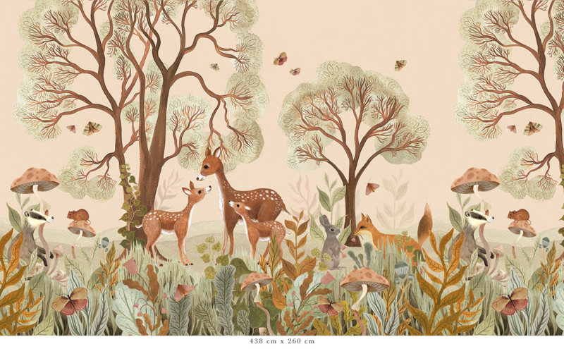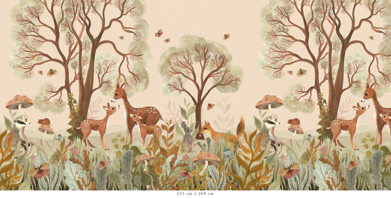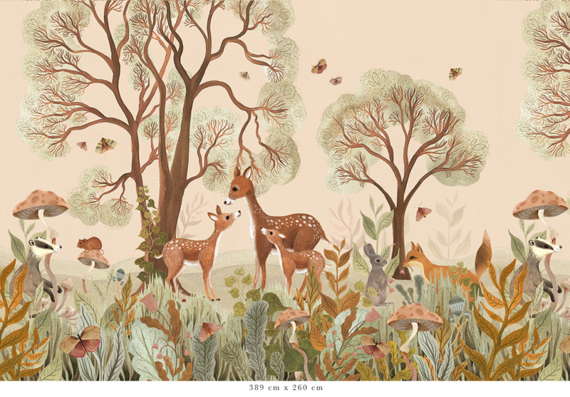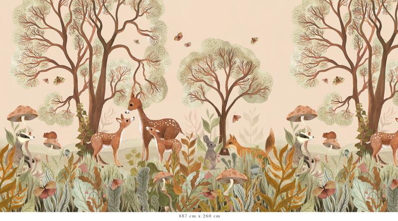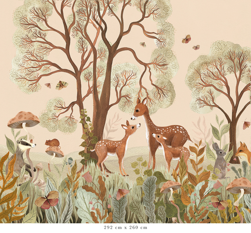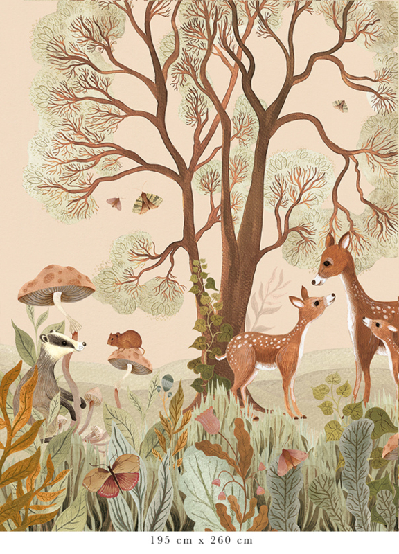 Das Design dieser einzigartigen Tapete ist vollständig handgemalt. Jedes Detail erzählt eine Geschichte, von den alten Bäumen bis zu den großen und kleinen Waldbewohnern, die sich zwischen Ästen und Blättern verbergen. In warmen und natürlichen Farben erwecken sie den Wald auf subtile Weise zum Leben.