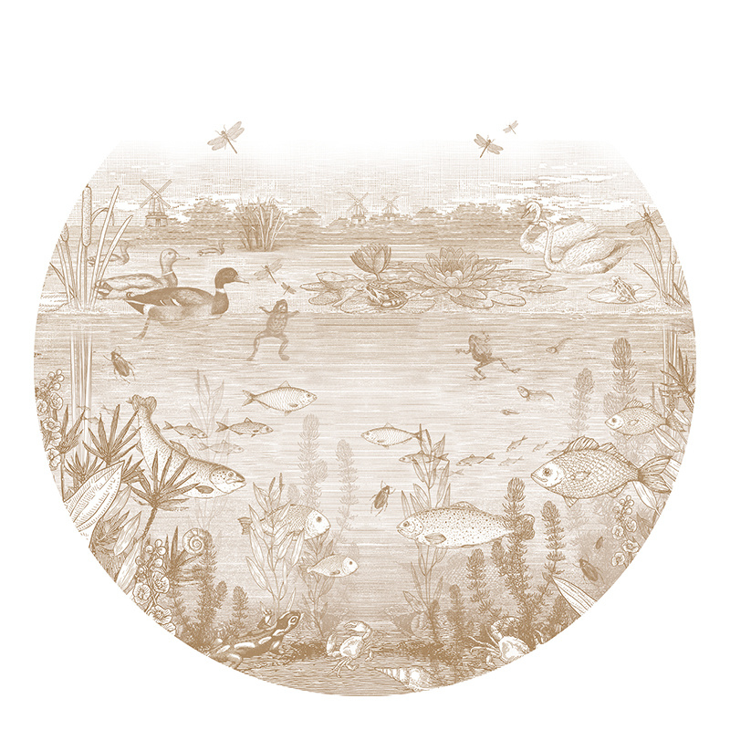 Unser Auf der Wasserseite Design gibt es auch als Tapetenkreis! Auf der Wasserseite ist eine klassische Toile de Jouy Tapete und hat einen neuen Look bekommen. Diese Tapete erinnert an das altmodische Schulposter von M.A. Koekkoek 'In Graben und Pfützen.'